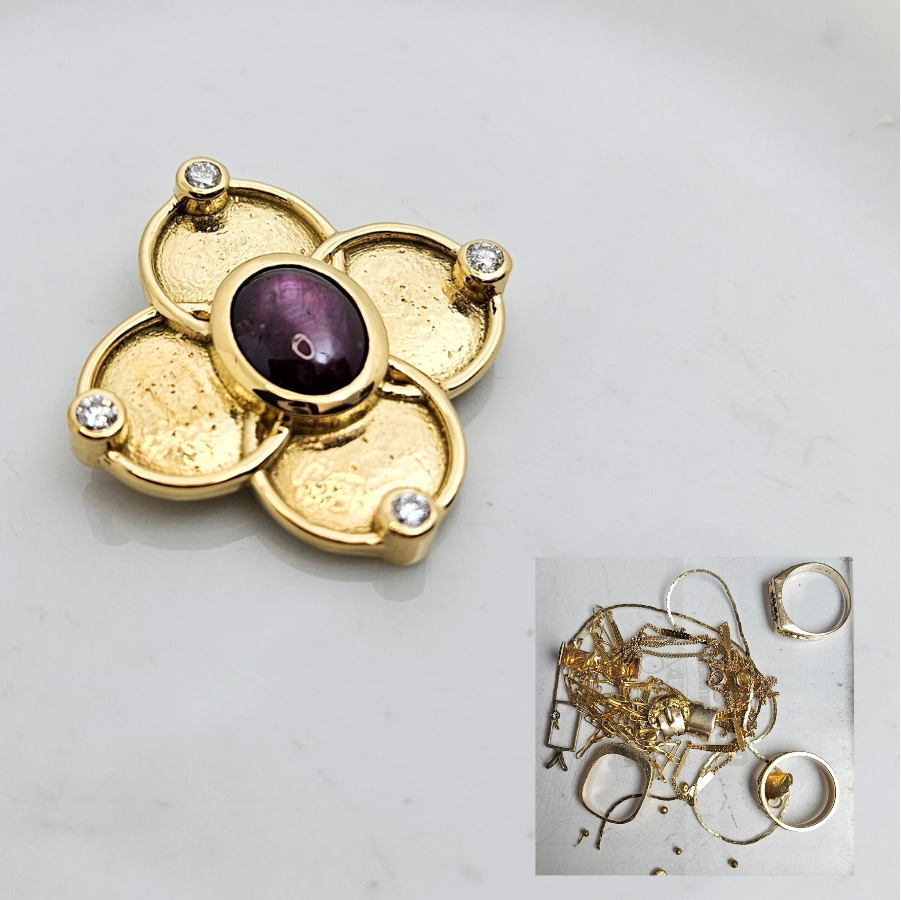 To create this 22K pendant, we refined several broken 10K chains and old rings. We used the pure gold to create a brand new high karat pendant, set with the client's purple sapphire and diamonds that came from the old rings.